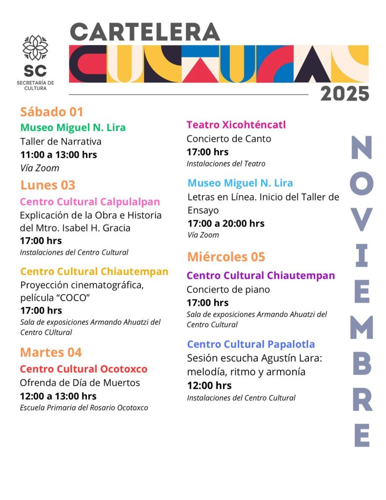 Cartelera Secretaría de Cultura, Primer Quincena de Noviembre 2025
